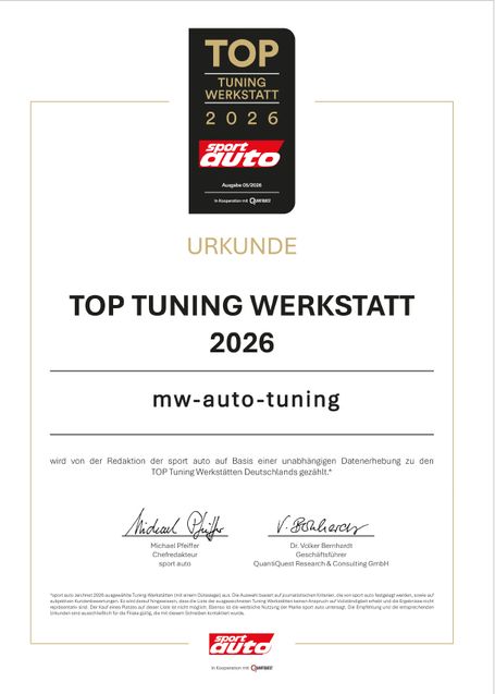 mw-auto-tuning gehört zu den Top-Adressen der Tuning-Branche in Deutschland! Das renommierte Fachmagazin sport auto hat uns nach 2025 zum zweitenmal in Folge zusammen mit dem Quantquest Institut unter die besten Tuning-Werkstätten Deutschlands gewählt. Diese Auszeichnung ist für uns ein riesiger Ansporn – und gleichzeitig ein Beweis für das Vertrauen unserer Kunden.